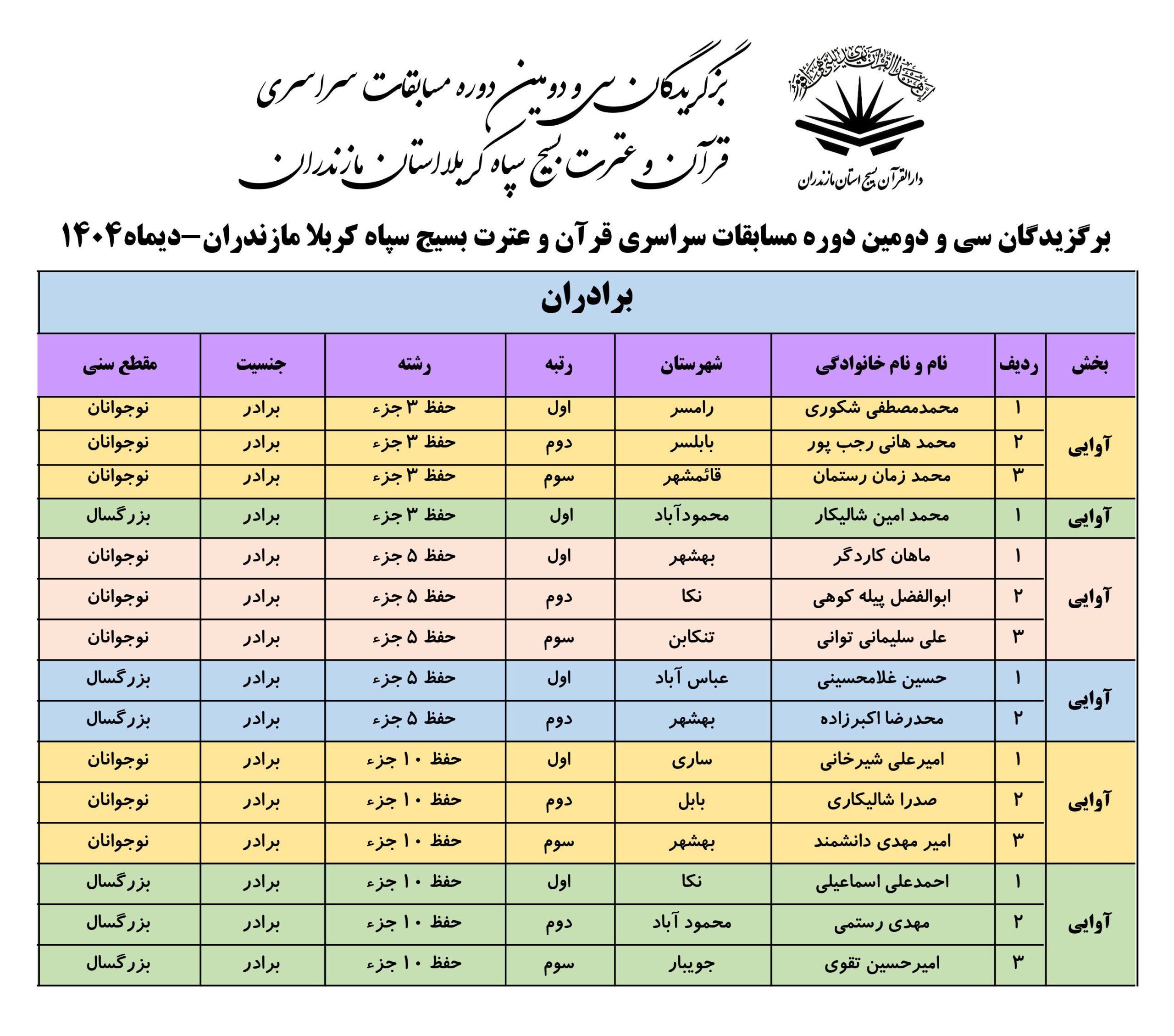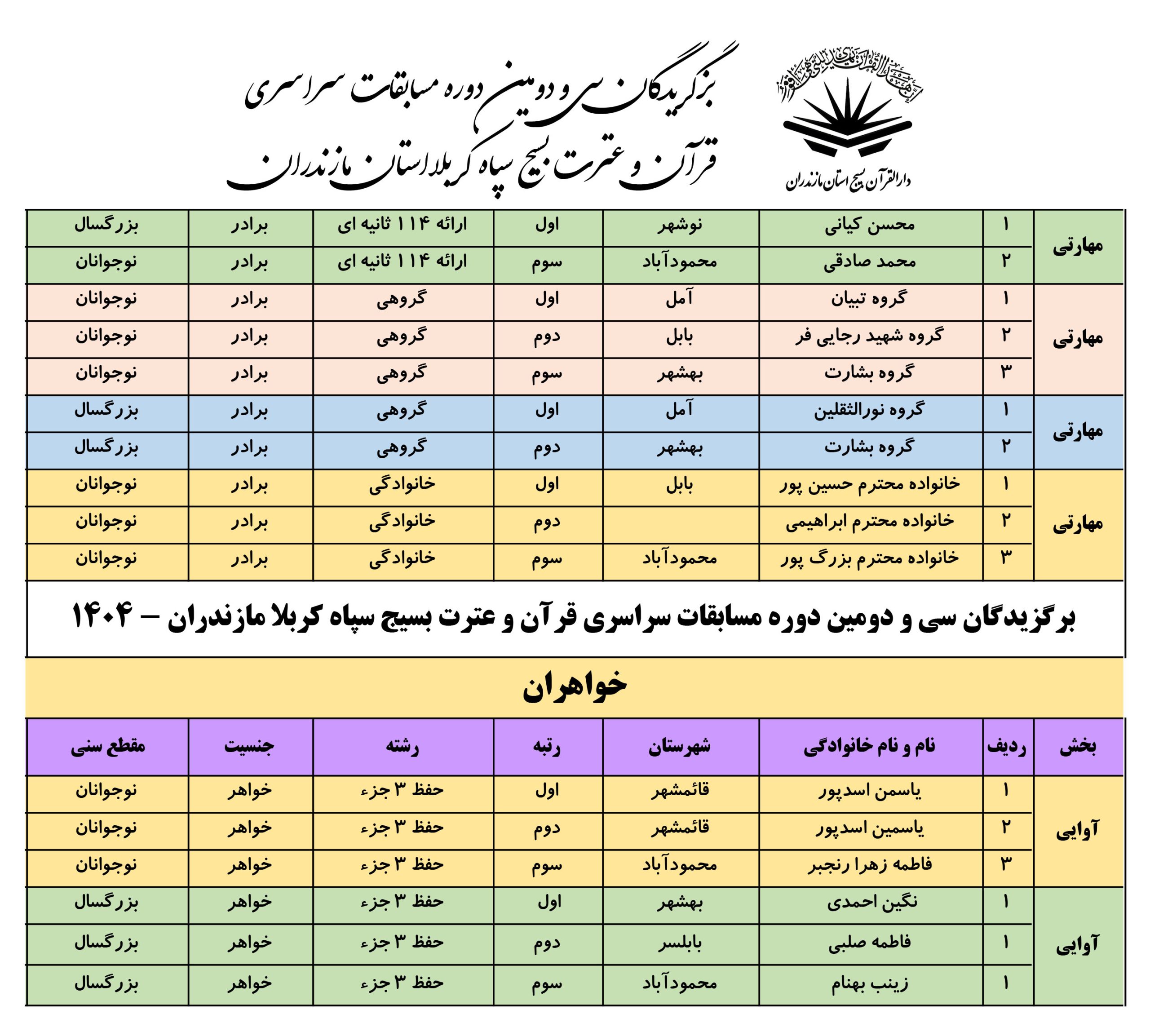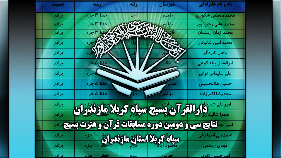 اعلام نتایج نهایی و اسامی برگزیدگان سی و دومین دوره مسابقات سراسری قرآن و عترت بسیج سپاه کربلا استان مازندران در رشته های ۱۵ گانه این دوره از رقابت ها