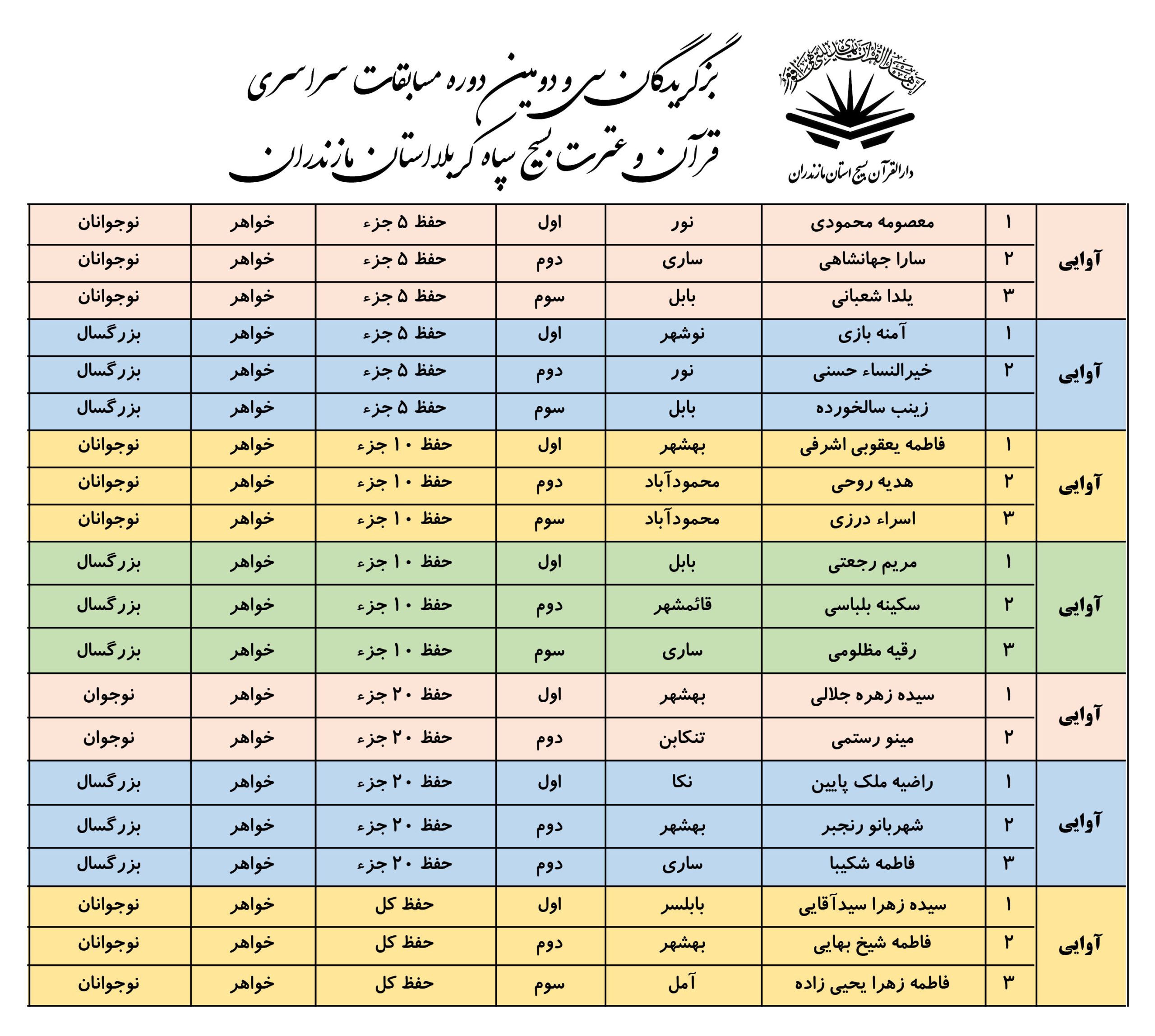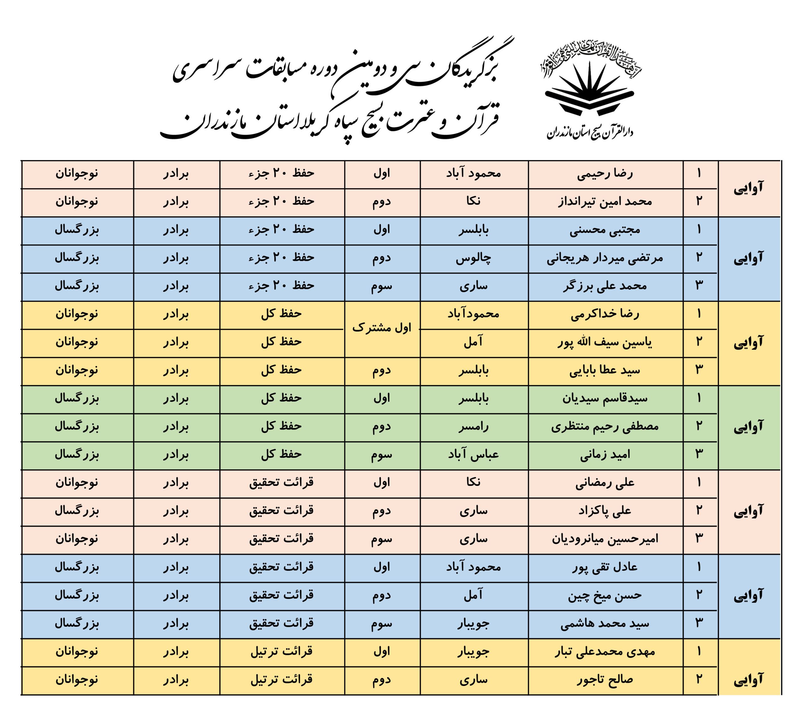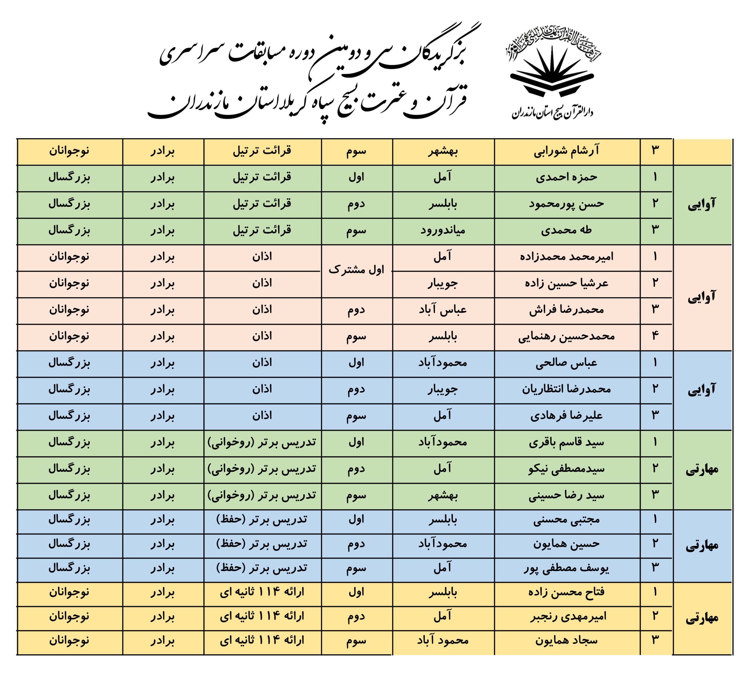 اعلام نتایج نهایی و اسامی برگزیدگان سی و دومین دوره مسابقات سراسری قرآن و عترت بسیج سپاه کربلا استان مازندران در رشته های ۱۵ گانه این دوره از رقابت ها